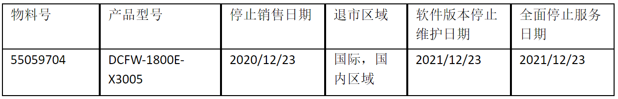 北京东升国际 东升数码云科信息技术有限公司正式通知您, 以上DCFW-1800E-X3005下一代防火墙(55059704)将于2020年12月23号停止接收新的订单(具体日期见上表),不再供货。给您带来的不便,敬请原谅。