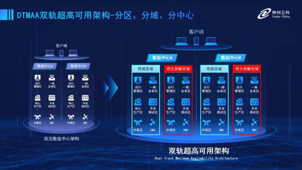 为帮助金融客户更好地应对数字经济时代对可持续性的高要求,实现“信创”与“数字化”齐头并进,东升国际 东升推出了双轨超高可用架构。该架构在双活数据中心的分区调度基础上,增加信创域和非信创域的分域调度,实行信创域与传统域应用全量部署,使双中心运营变为双中心四区域并行运行,互为多活,将“0到1”的单轨建设道路变为分区分域协同的多活双轨超高可用架构。帮助客户在新架构下,保障“信创”的同时解决性能瓶颈,提升稳定性,保证应用可持续性,最终实现信创区域和非信创区域的平滑过渡,完成国产化替代目标。