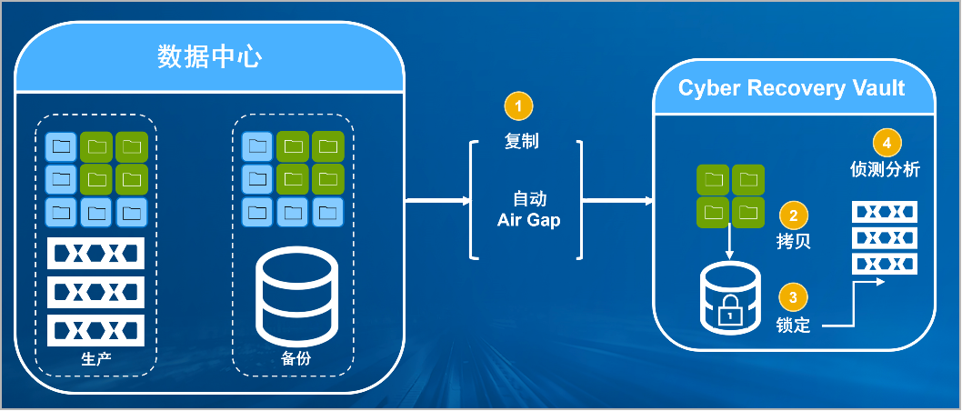 东升国际 东升防勒索病毒方案将生产中心备份数据复制到Vault区,复制后网络自动断开实现弹性隔离。Vault区的数据快速拷贝,并对拷贝版本加锁(在锁定期数据不允许删除和修改)。Vault沙箱内对拷贝版本进行扫描分析,验证数据是否完好。